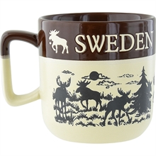 Tvåfärgad stengodsmugg i beige och brunt med etsat svart älgmotiv. Muggens övre utsida och hela insida är i vackert chokladbrun lasyr som skapar en blank yta. Produktens kvalitetskänsla återfinns även i den robusta utformningen.